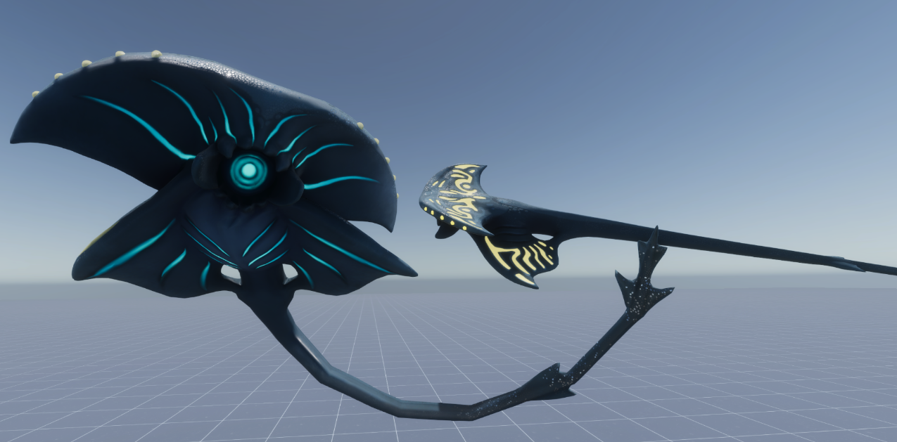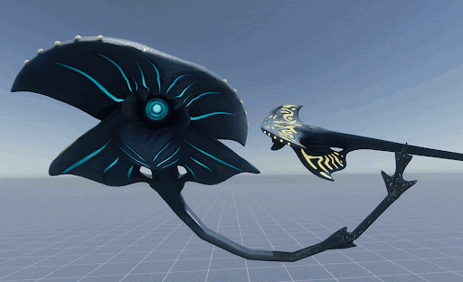 Below is a look at an early version of the Manta Ray model, looking to add more detail over the original creature model taken from Worlds Adrift - players can expect to meet the creatures regularly on their adventures, as they soar through the skies. Don't be fooled by their elegant appearance however, the Manta is a vicious predator and is attracted by sound. We wanted to use the emissive patterns on the Manta's body to help show the moods of the manta, as well as telegraph some attacks, which can be seen in the animated gif below.