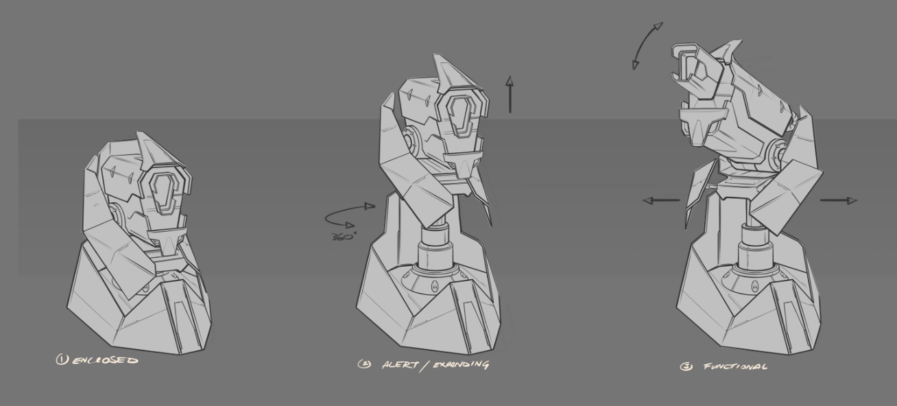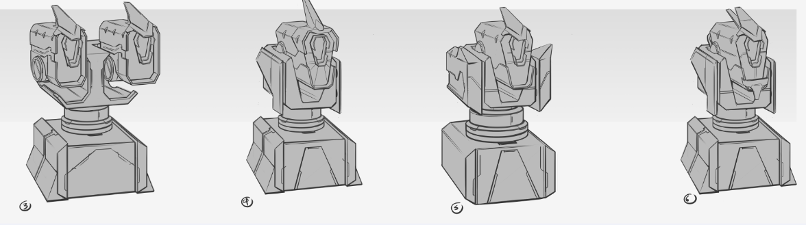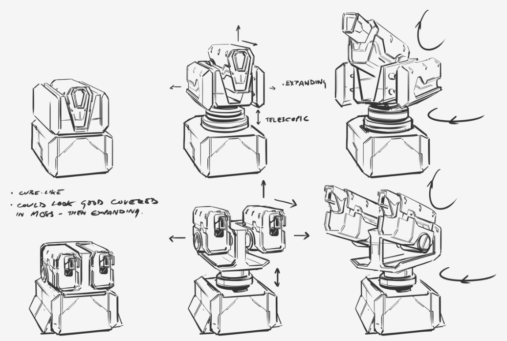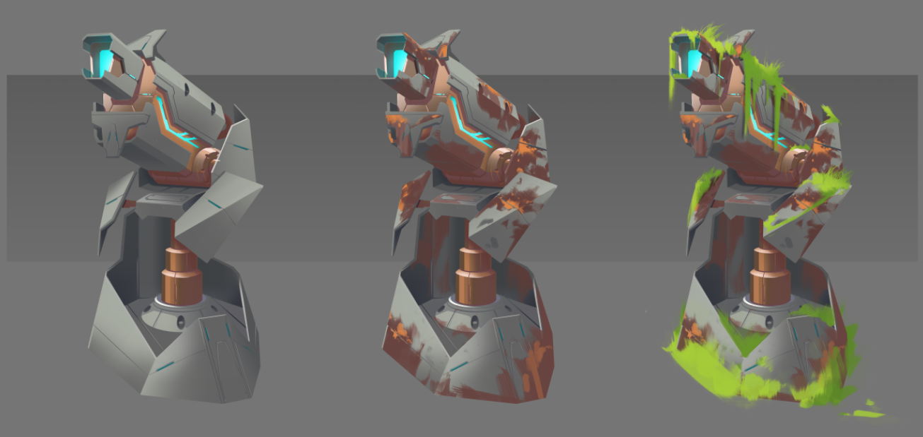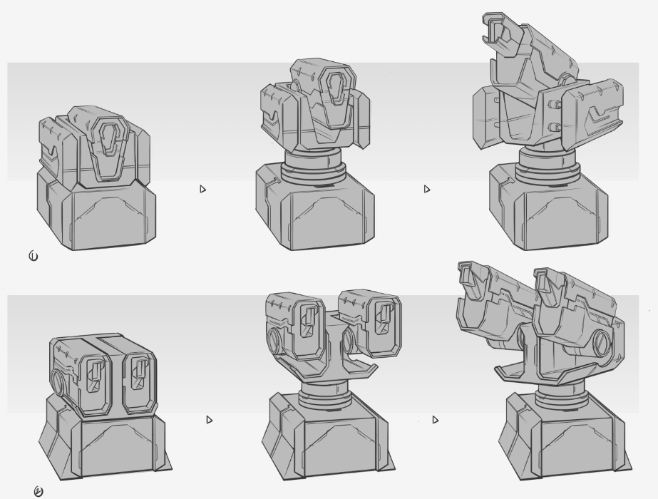Next up from our art team, a look at some early concept work for our Saborian island turret designs. Whilst the design may not be final, the idea of different states of unpacking is something we want to keep going forward. We also experimented with different colour schemes and different levels of wear and tear.